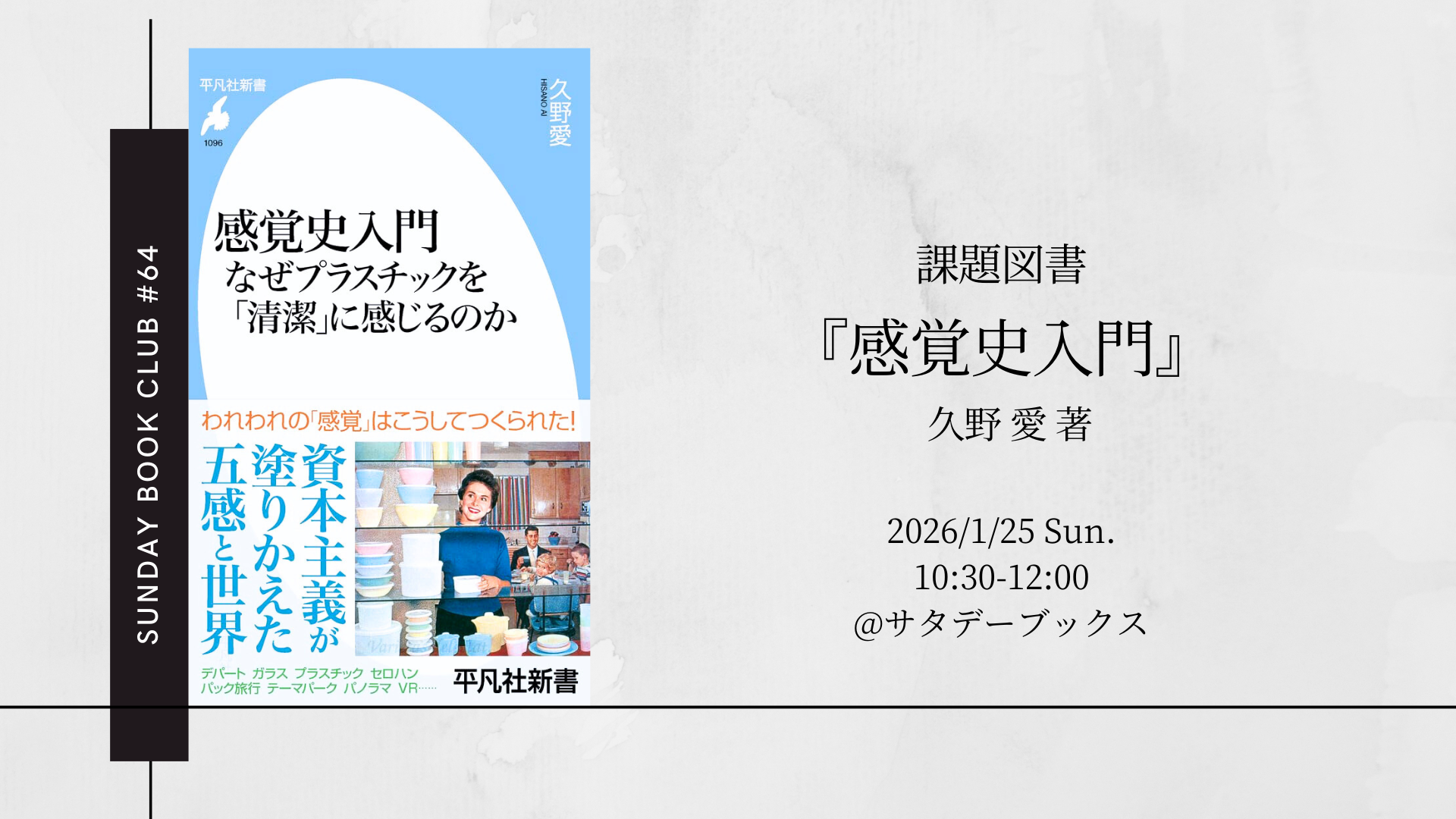 毎月開催しているサタデーブックスとシン図書館の読書会です。1月はシン図書館の選書で 久野愛著『感覚史入門 なぜプラスチックを「清潔」に感じるのか』を課題図書とします。